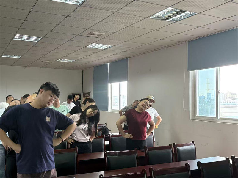 最后,李老师为大家破解了 “久坐困局”。他分析了“久坐”对颈椎、腰椎及心血管系统的危害,并现场示范教学办公室颈椎放松动作操(从简单的头部绕环、肩颈拉伸)。现场鑫和员工们纷纷起身跟随李老师练习,大家沉浸式体验肩颈拉伸运动带来的身体放松,有效缓解了久坐带来的身体不适。