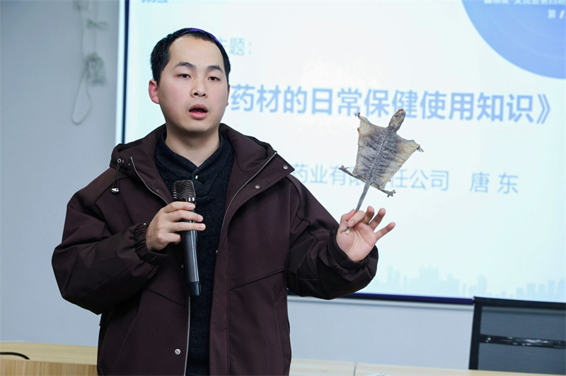 四川鑫仁泰药业有限责任公司总经理唐东分享了《中药材的日常保健使用知识》。唐总以自身家族的中药种植经验跟大家分享了中药种植的风险与回报,更以动物标本向大家展示了中药的魅力,还就行业当下的困境及破局思路与大家进行了探讨。